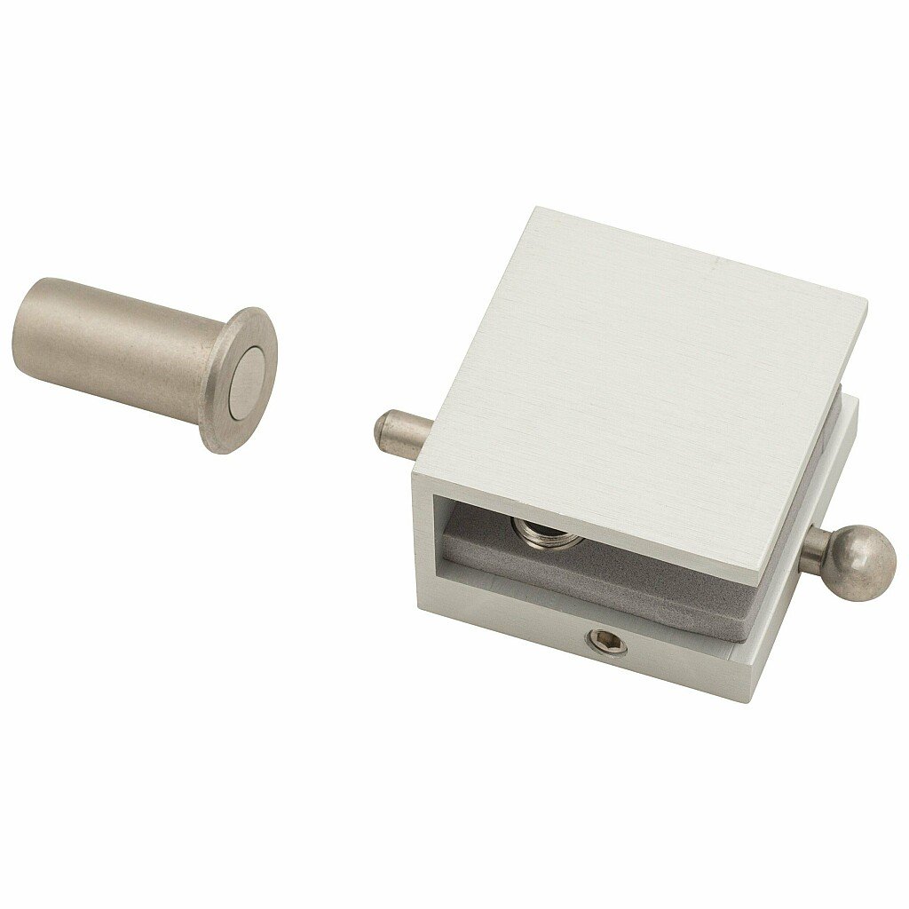 Описание: Один из элементов для монтажа двухпольной (распашной) стеклянной двери - шпингалет. Предназначен для фиксации стеклянного дверного полотна в закрытом положении. Один или два шпингалета (на выбор) крепятся к одному из полотен.